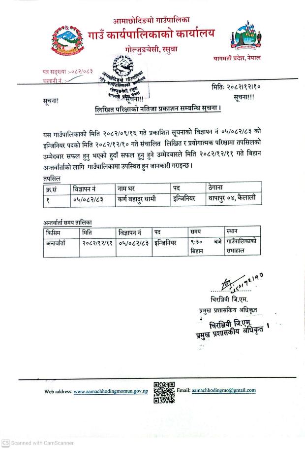 इन्जिनियर पदको लिखित परिक्षाको नतिजा साथै अन्तर्वार्ता मिति प्रकाशन सम्बन्धि सूचना ।