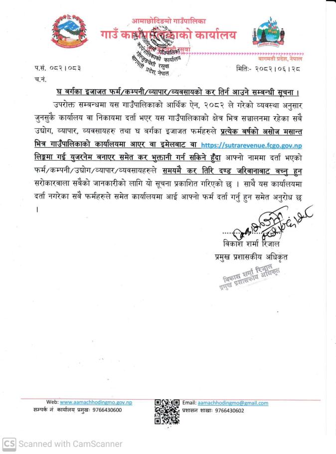घ बर्गको इजाजत फर्म/कम्पनी/व्यापार/व्यवसाय कर तिर्न आउने सम्बन्धी सूचना ।।