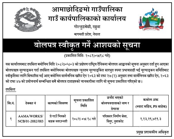 बोलपत्र स्वीकृत गर्ने आशयको सूचना ।