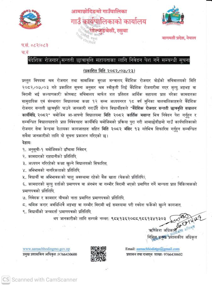 वैदेशिक रोजगार सन्तती छात्रावृत्ति सहायताका लागि निवेदन पेश गर्ने सम्बन्धी सूचना ।