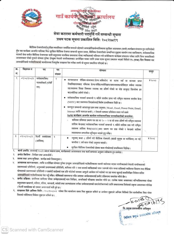 सेवा करारमा कर्मचारी पदपूर्ति गर्ने सम्बन्धी सूचना प्रथम पटक सूचना प्रकाशित मितिः २०८२।७।१९